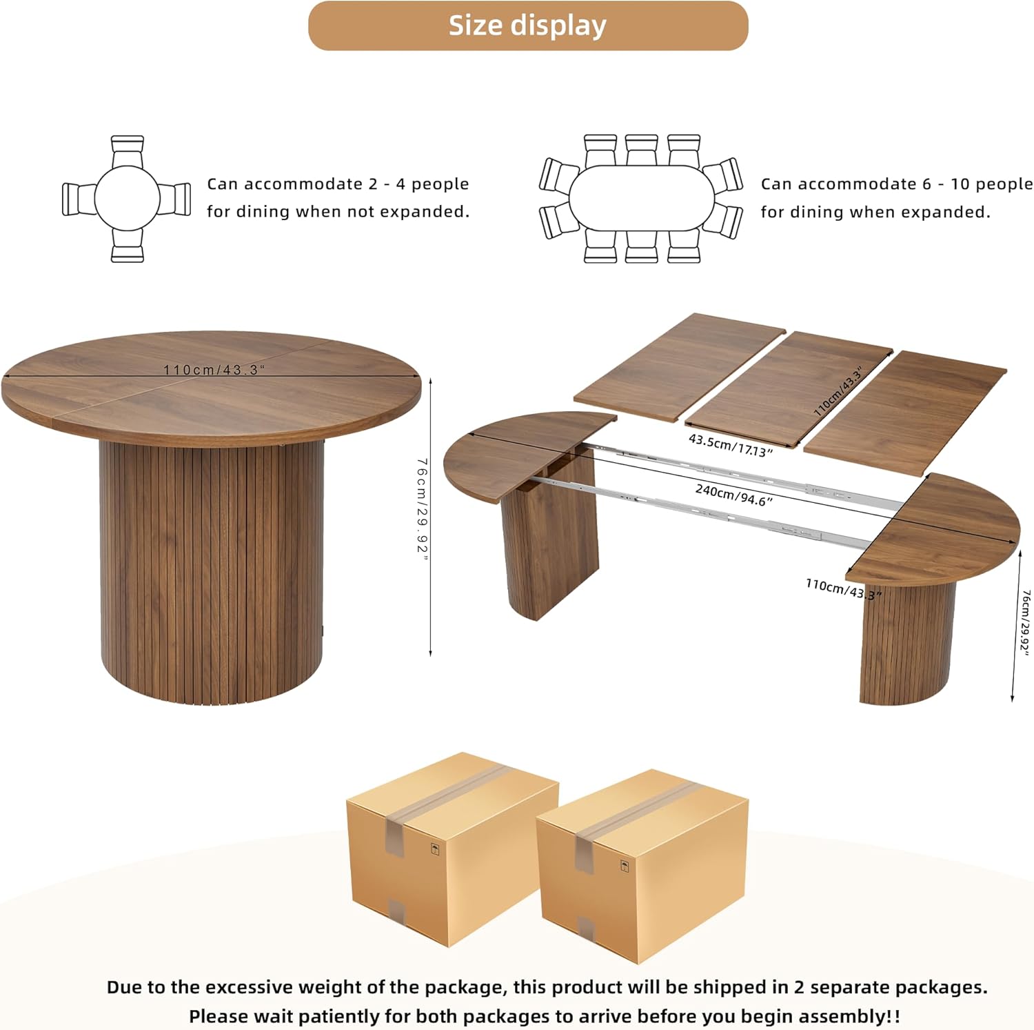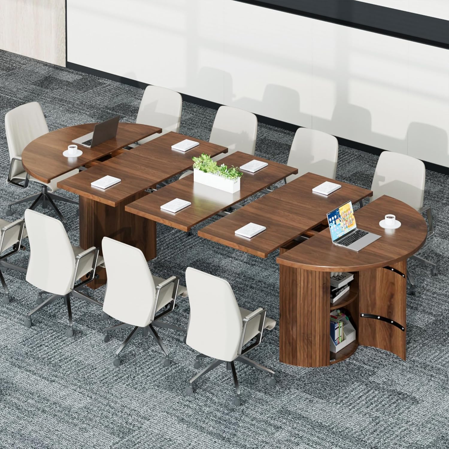 8FT Long Extendable Oval Conference Table for 4-10, 43-95 Inch Round Meeting Room Table with 3 Leaf, 2 Storage, Space Saving Fluted Circle Desk for Office, Conference Room, Boardroom, Seminar, Walnut