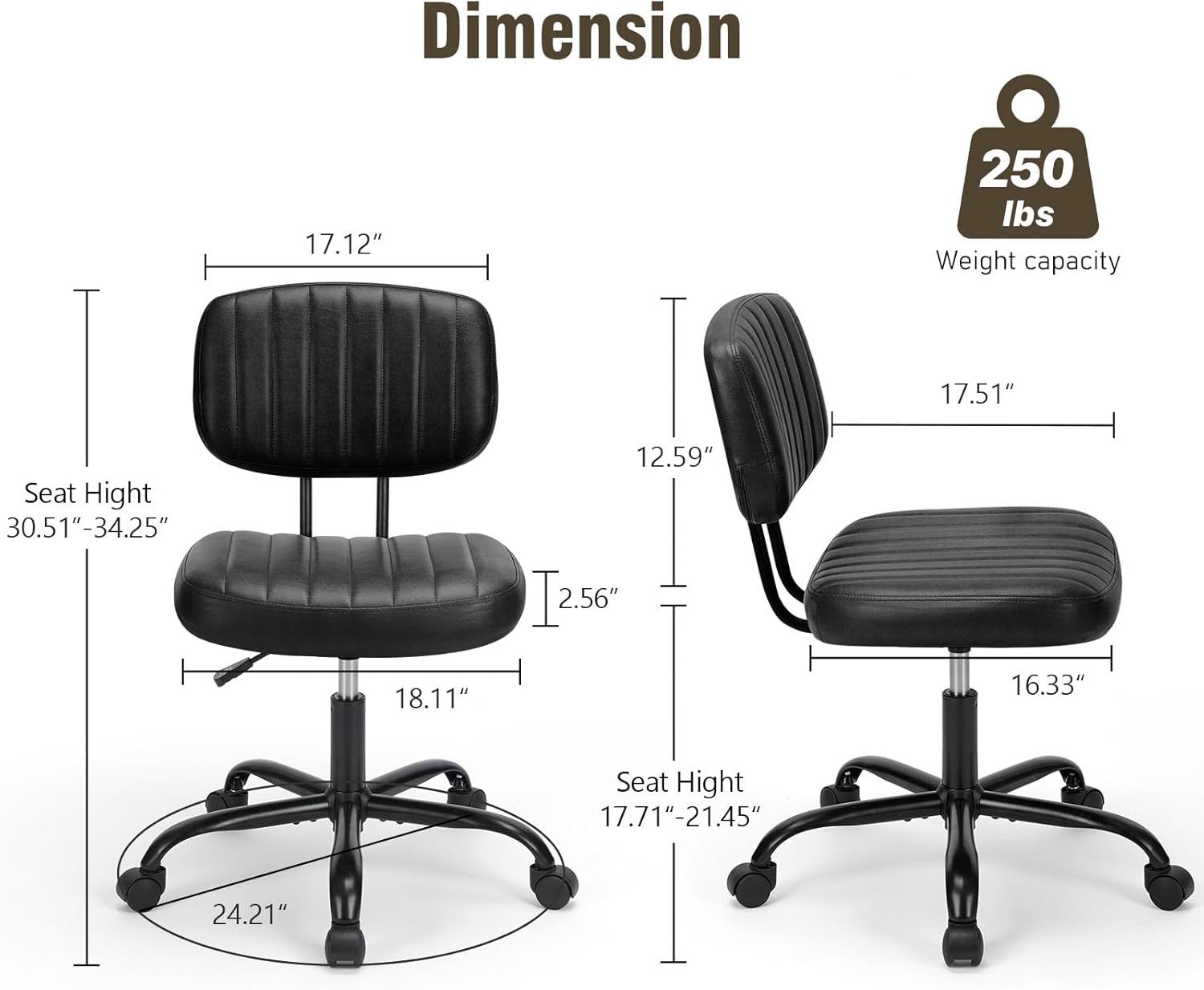 SPACE SAVING DESIGN – This small armless office chair is designed with space-saving features in mind. The height-adjustable dimensions (24.21″(L) x 16.33″(W) x 34.25″(H)) ensure that it will fit perfectly into any office or workspace. Additionally, the armless design makes it easy to store it under your desk when not in use, maximizing the available space in your office area.